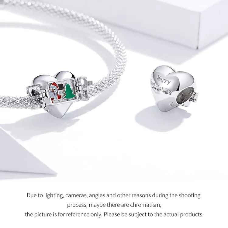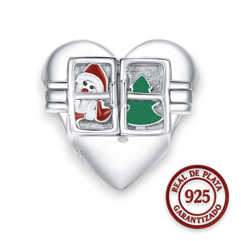 Charm en forma de corazón con ventanitas que muestran un Santa y un arbolito navideño. Hecho en plata 925 certificada y con garantía de 6 meses. Un detalle tierno y festivo para esta Navidad. 🎄✨